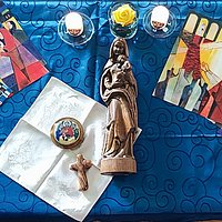 Pfarrei St. Martin Idsteiner Land 40 Jahre Frauentreff in Maria Königin M. Friedrich Die Bilder auf dem Tisch wurden von Christel Holl gemalt und diese wurden im Wortgottesdienst erklärt 40 Jahre Frau