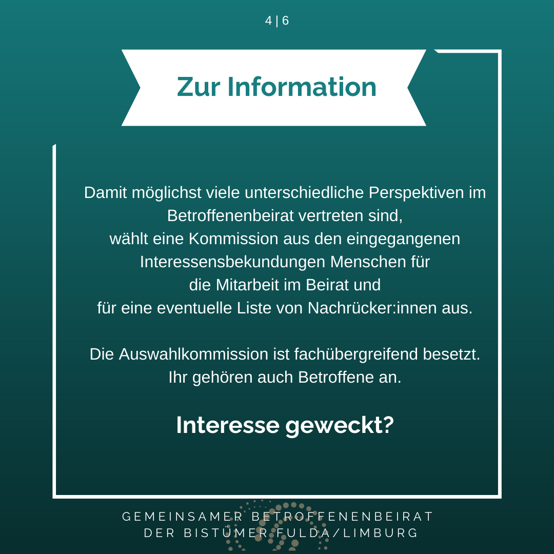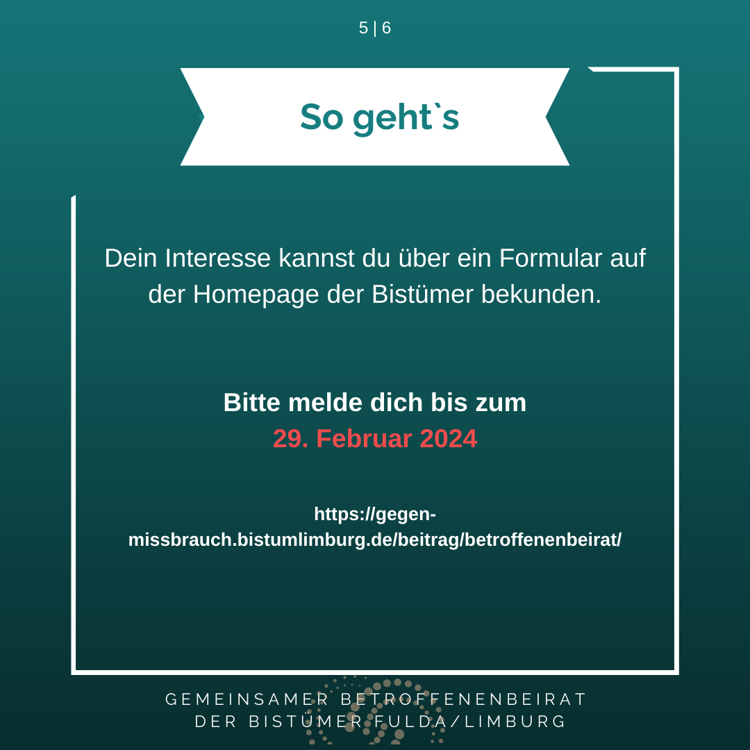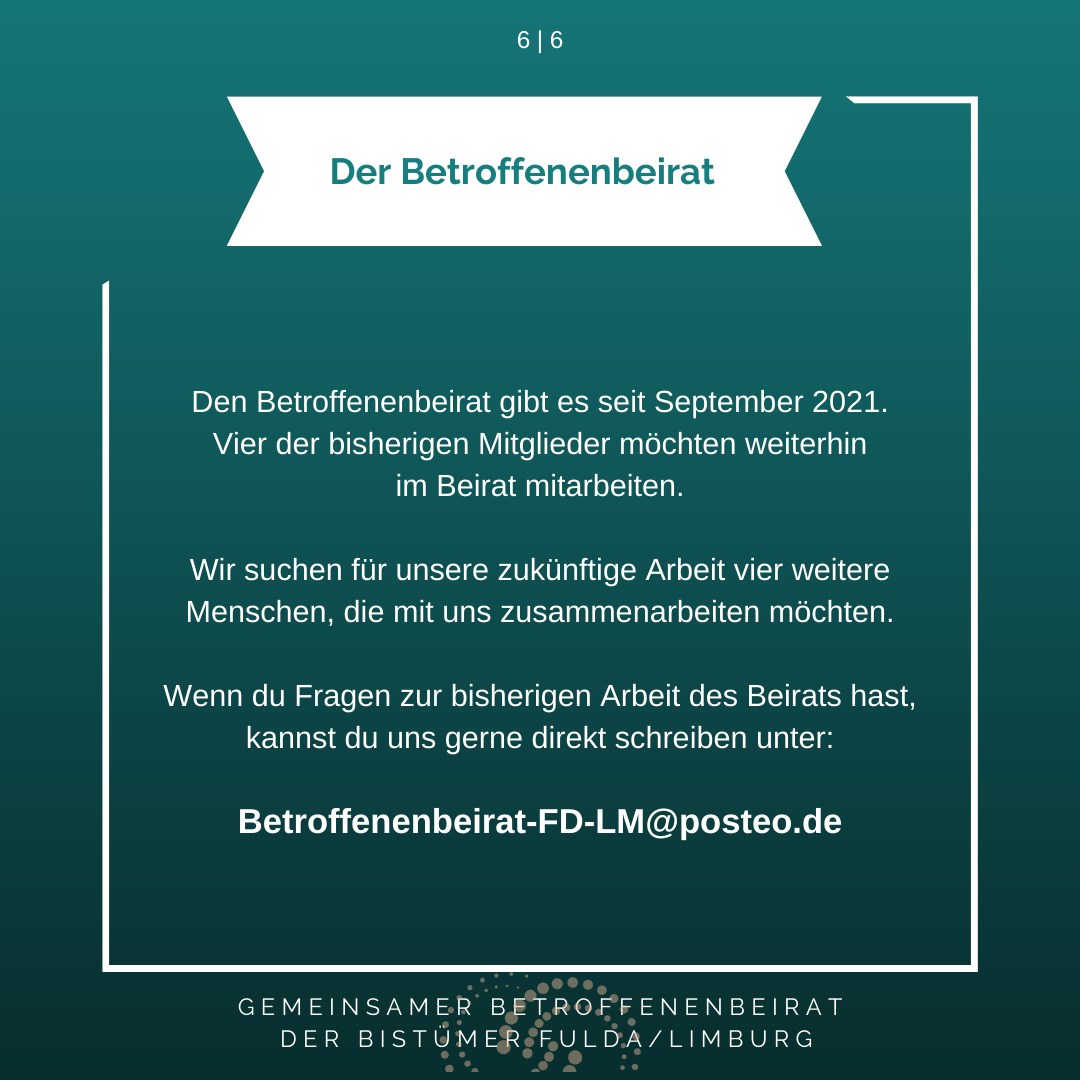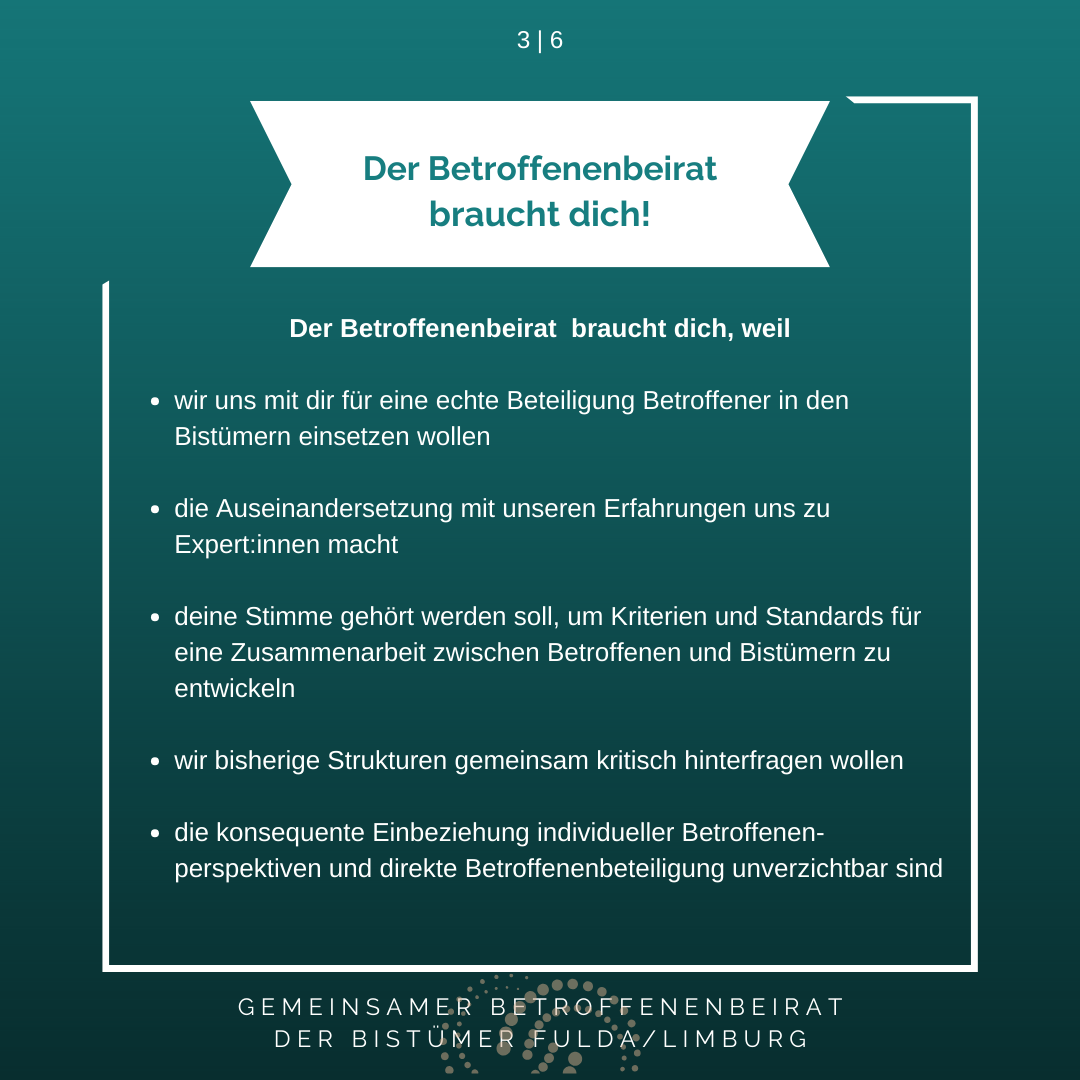 Die Deutsche Bischofskonferenz hat im April 2020 verbindliche Kriterien und Standards für eine unabhängige Aufarbeitung von sexuellem Missbrauch in der katholischen Kirche in Deutschland beschlossen. Sie sehen eine maßgebliche strukturelle Beteiligung von Betroffenen an den Aufarbeitungsprozessen vor, insbesondere durch Mitarbeit in den diözesanen Kommissionen. Die Bistümer Fulda und Limburg haben für diese strukturelle Beteiligung einen gemeinsamen Betroffenenbeirat eingerichtet: