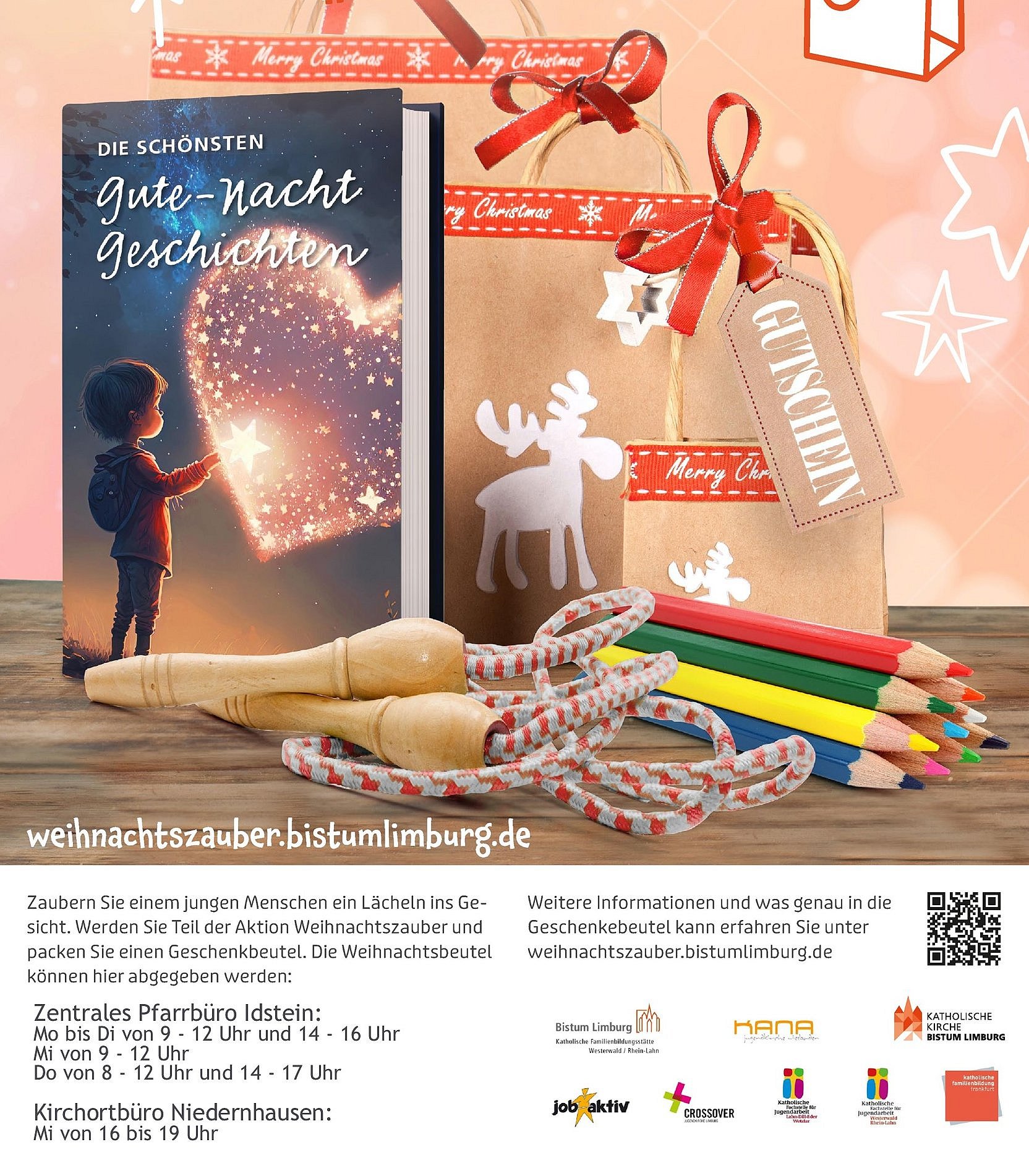 Packen Sie bis zum 28. November einen Geschenkbeutel und bringen Sie ihn in das Pfarrbüro. Von den zentralen Sammelstellen werden diese an Einrichtungen für bedürftige Kinder und Jugendliche im Bistum Limburg gespendet.