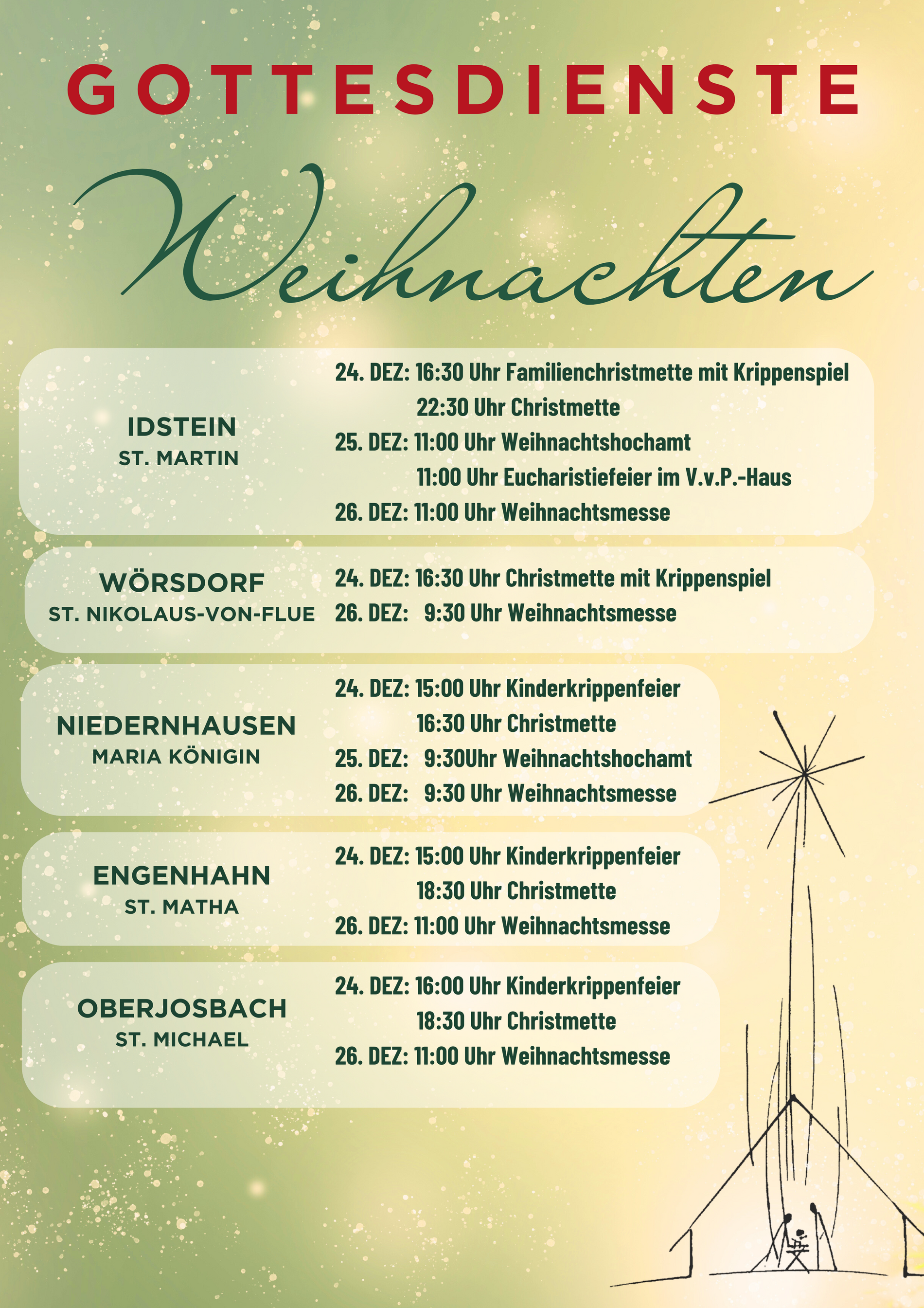 Wir laden Sie herzlich an Heiligabend und Weihnachten zu Gottesdiensten in die verschiedenen Kirchen der Pfarrgemeinde ein und freuen uns, die Weihnachtsgottesdienste mit Ihnen gemeinsam zu feiern.