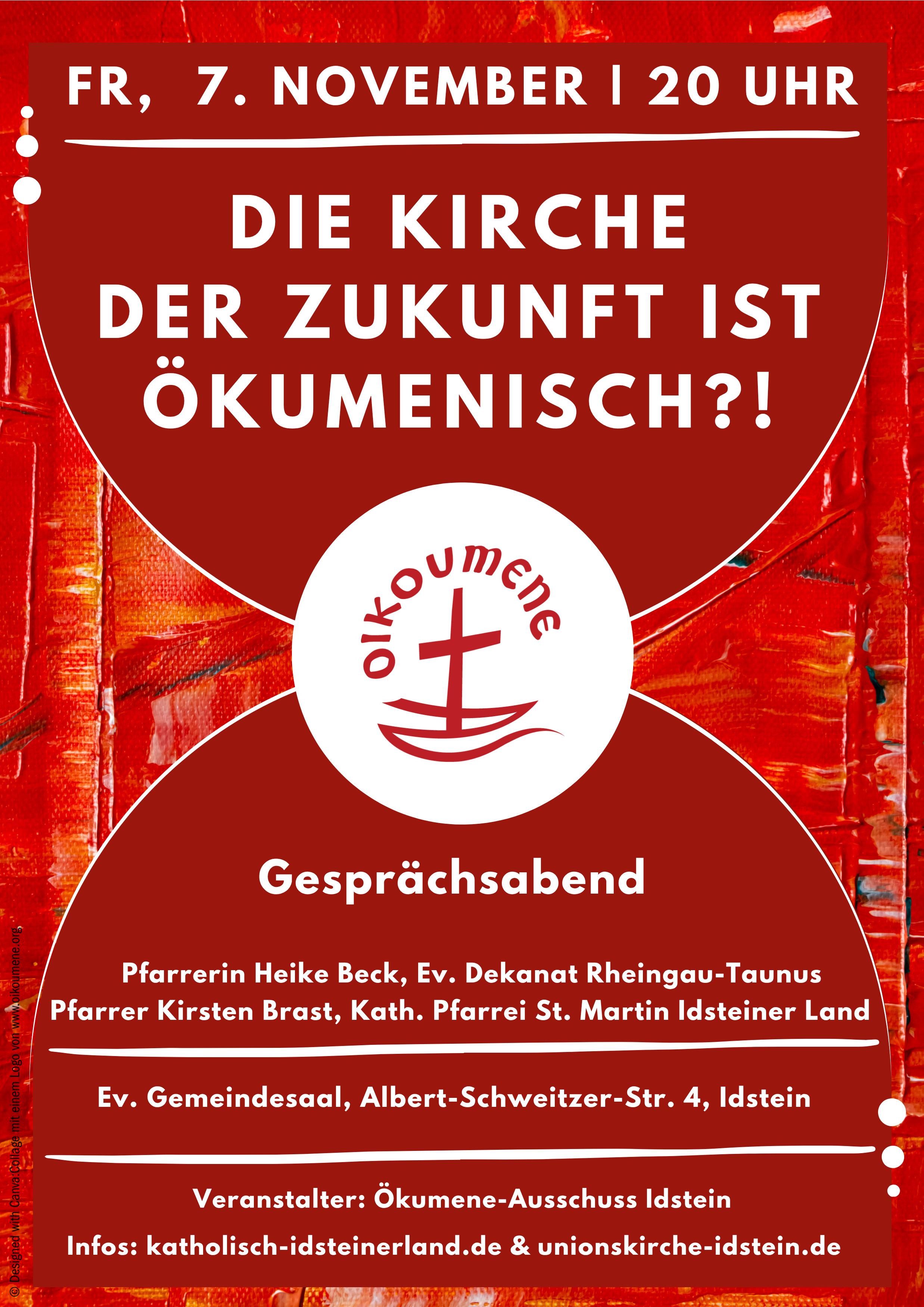 Pfarrerin Heike Beck vom Evang. Dekanat Rheingau-Taunus und Pfarrer Kirsten Brast von der Kath. Pfarrei St. Martin Idsteiner Land und begeben sich mit den Teilnehmenden zusammen auf eine Reise in die Geschichte der Ökumene seit dem Zweiten Weltkrieg. Sie schauen auf das, was heute ökumenisch bereits möglich ist und gelebt wird, auch in der katholischen Region Wiesbaden-Rheingau-Taunus bzw. den Nachbarschaftsräumen des evangelischen Dekanats. Schließlich wagen sie einen Blick, wie eine Zukunft der Kirchen aussehen kann, in der Ökumene noch selbstverständlicher gelebt werden könnte als heute.