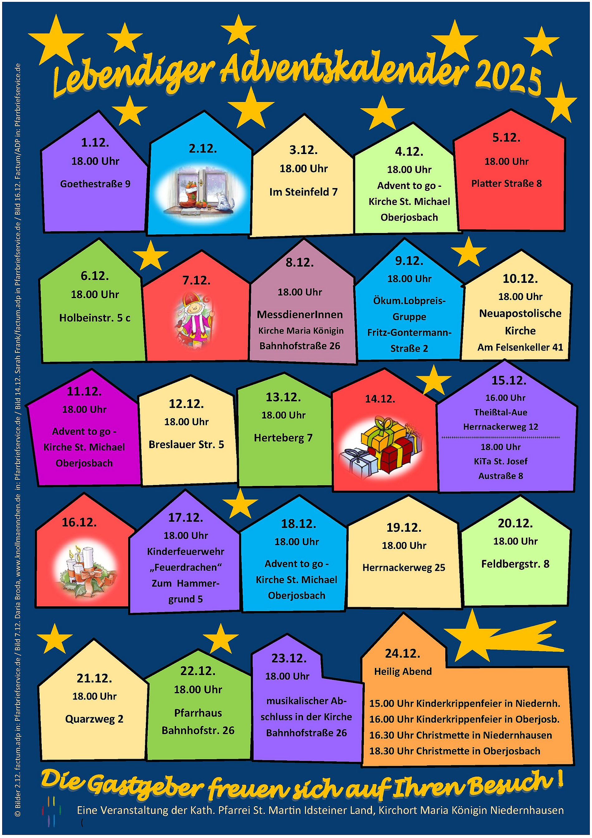 Am 1. Dezember wird das erste Fenster bei Familie Schmack-Haunert in der Goethestraße 9 in Niedernhausen geöffnet. Bitte entnehmen Sie die weiteren Termine dem Aushang oder dem nächsten Pfarrbrief.
