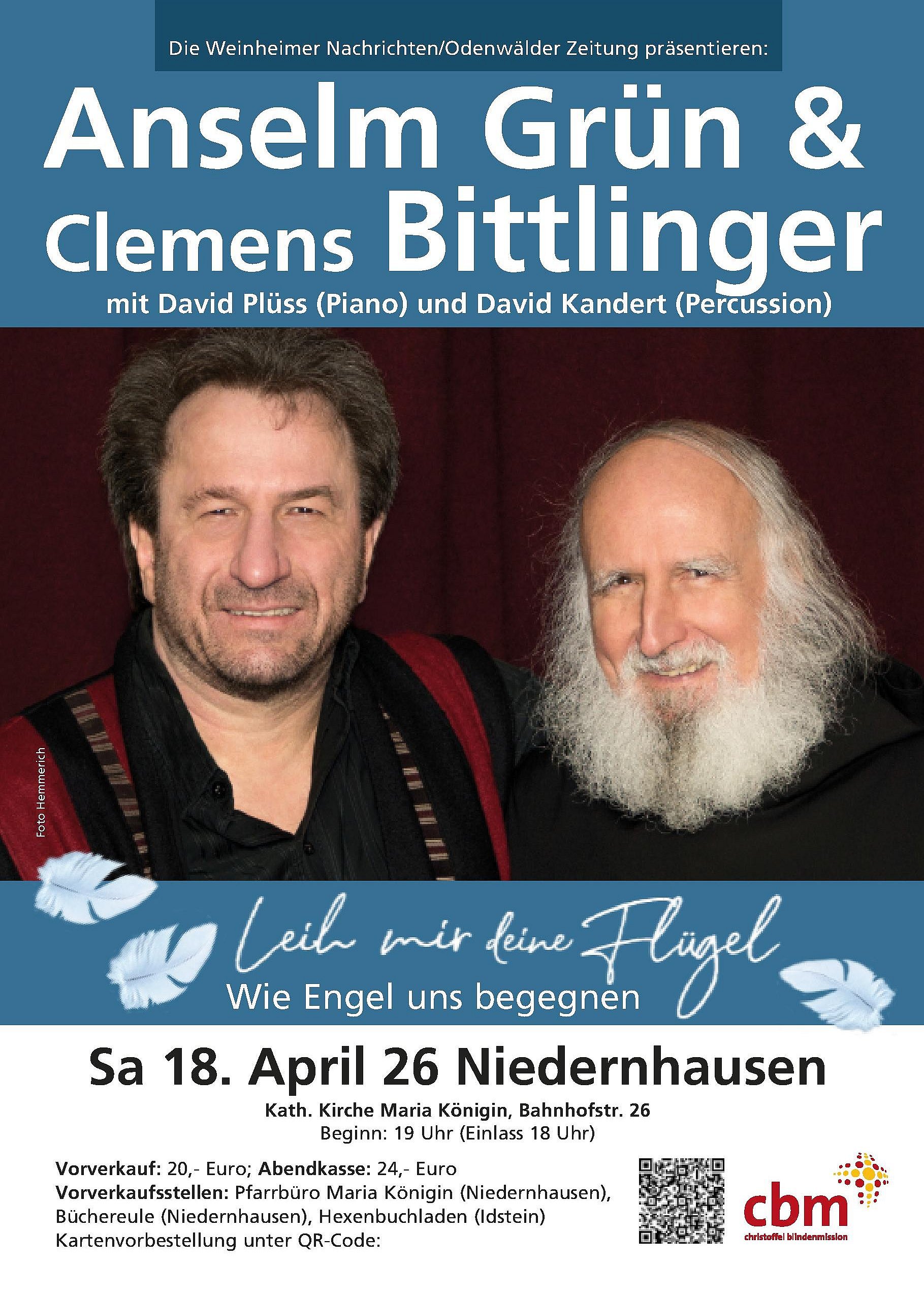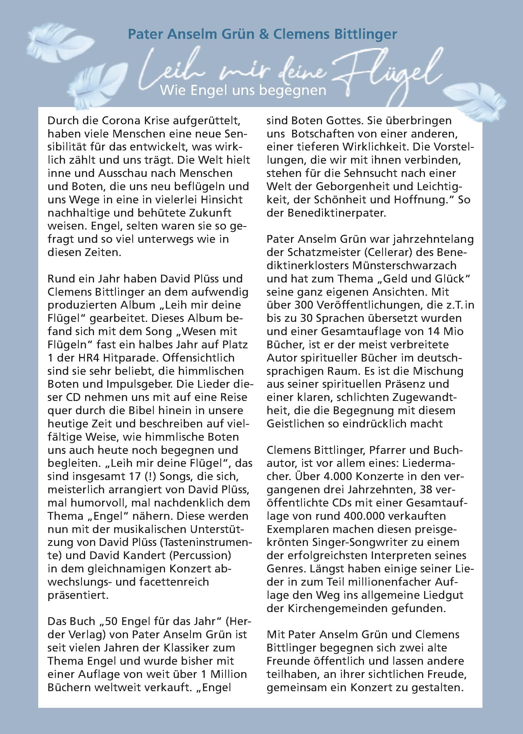 Am Samstag, 18. April, präsentieren Anselm Grün und Clemens Bittlinger mit seinen Musikern in Niedernhausen ihr Konzert "Leih mir deine Flügel"