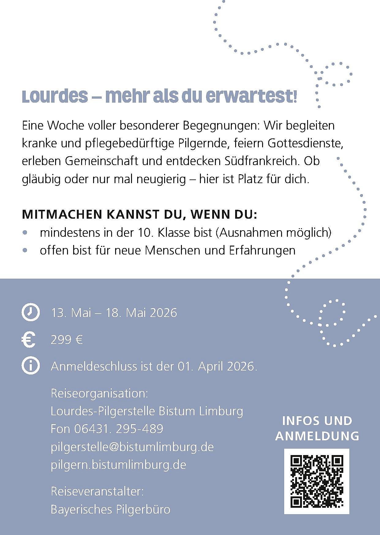 Anmeldung bis 01. März 2026. Bitte Anmeldeformular direkt an das Bayerische Pilgerbüro senden.