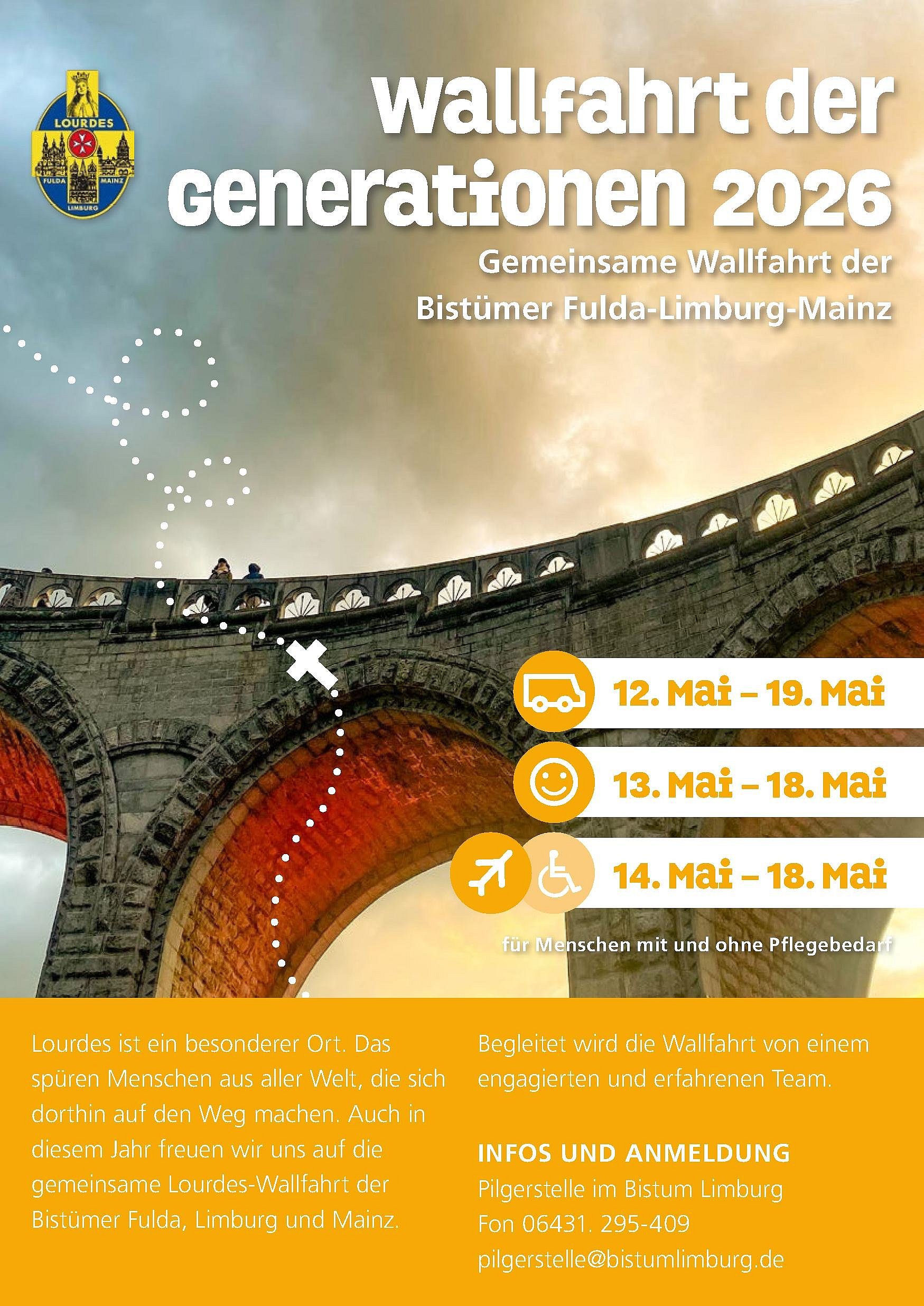 Über Christi Himmelfahrt findet die gemeinsame Wallfahrt der Generationen 2026 der Bistümer Fulda, Limburg und Mainz nach Lourdes statt.